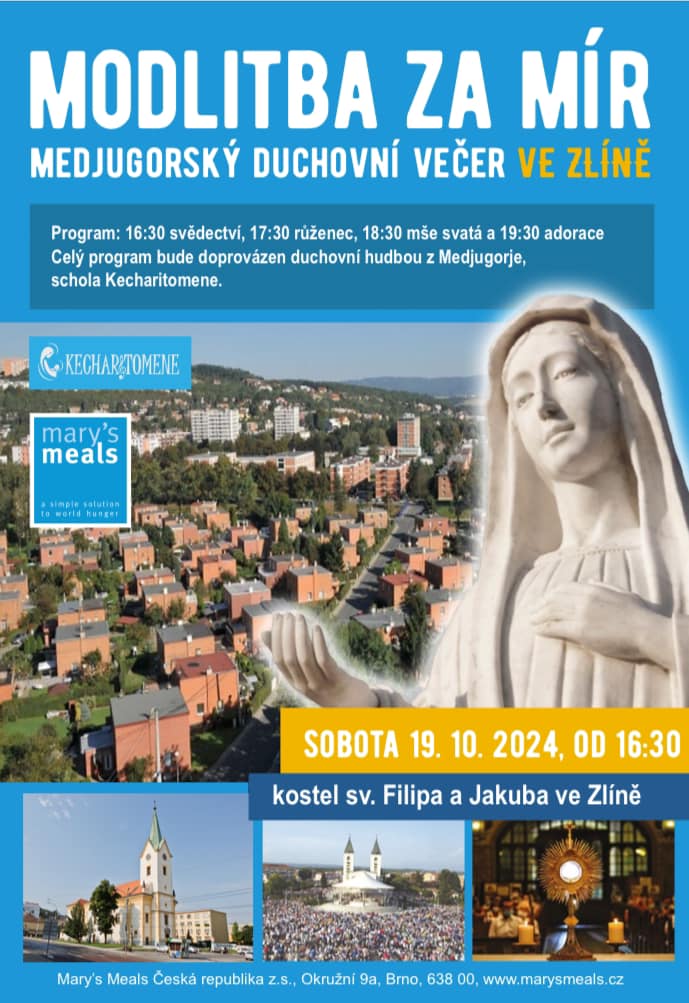 Srdečně vás zveme na medjugorský duchovní večer, který se uskuteční v sobotu 19. října 2024 v kostele sv. Filipa a Jakuba ve Zlíně pod záštitou organizace Mary’s Meals. Tento večer modlitby a rozjímání je inspirován každodenním medjugorským večerním modlitebním programem, který bude příležitostí společně se modlit za mír ve světě a přiblížit se duchovnímu odkazu Medjugorje.