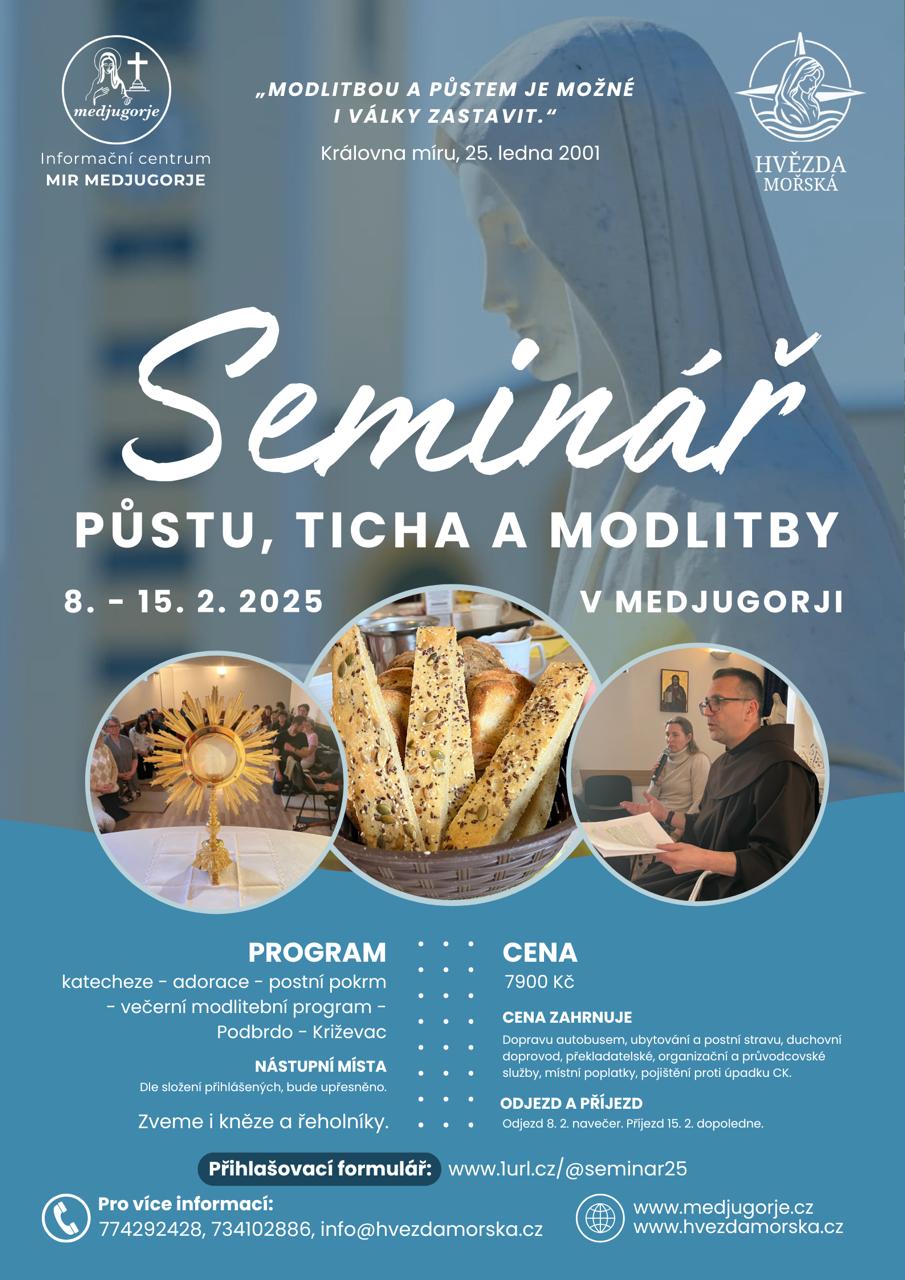 Srdečně vás zveme k účasti na II. ročníku SEMINÁŘE PŮSTU, TICHA A MODLITBY, který se uskuteční v termínu 8. – 15. února 2025 v Medjugorji. Toto duchovní cvičení založil v roce 1991 zesnulý medjugorský farní vikář fra Slavko Barbarić, OFM se záměrem poskytnout poutníkům možnost hlubšího a důvěrnějšího setkání s Bohem.